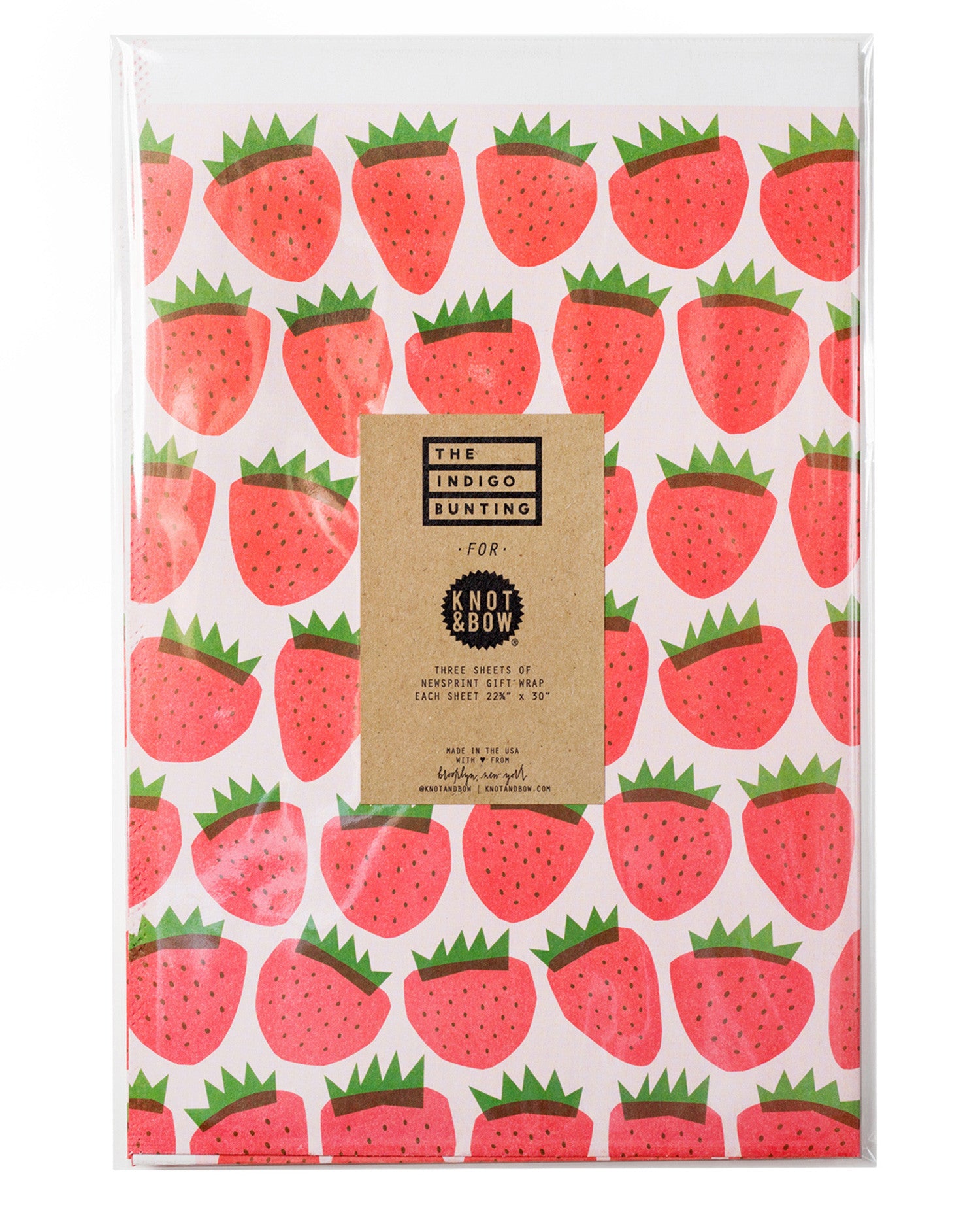 This adorable strawberry wrapping paper pack was designed by New York City-based designer and illustrator Erin Jang of The Indigo Bunting. It has a newspaper feel with its 25% recycled paper and is sure to add sweetness to any gift or favor.